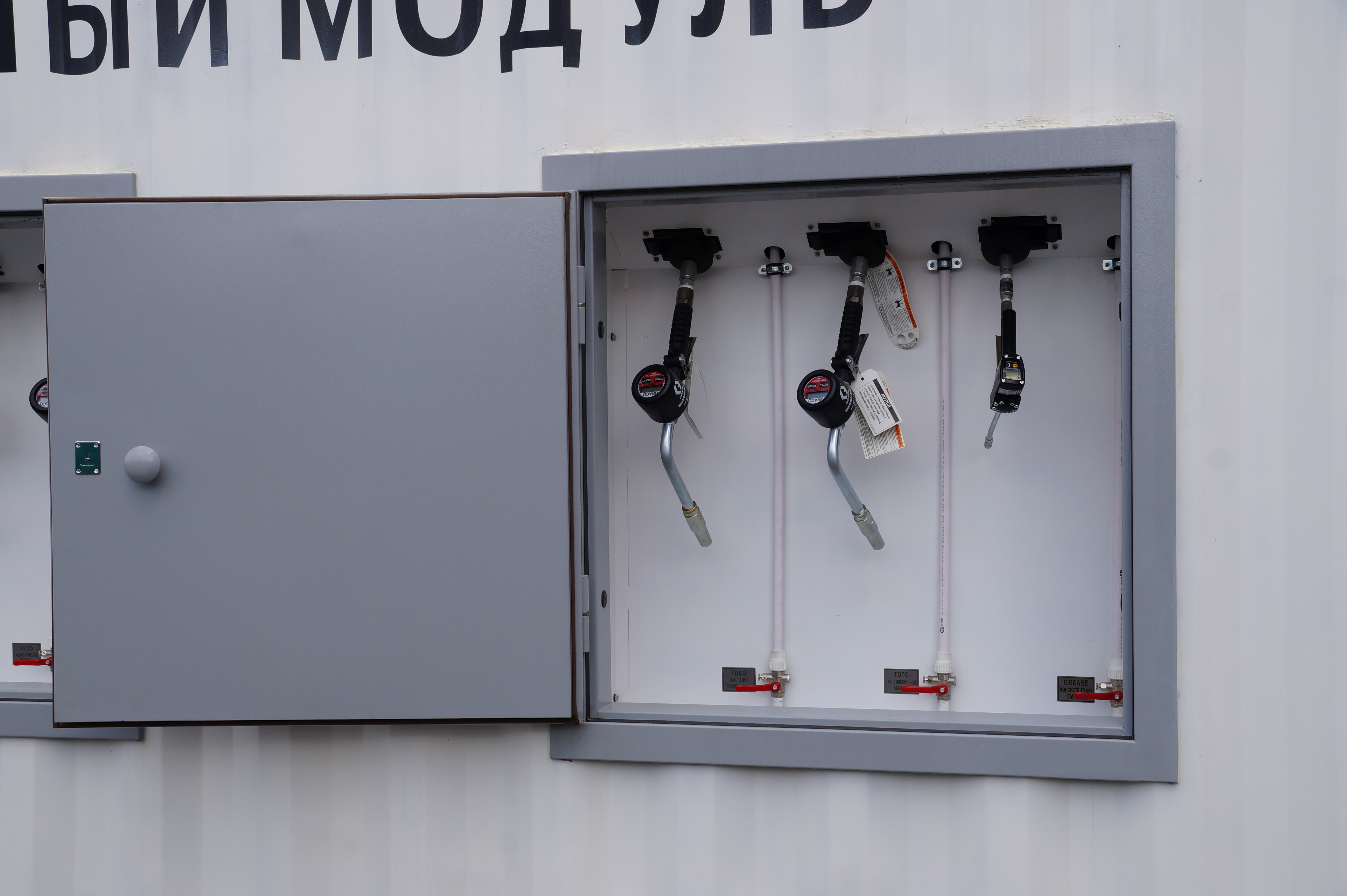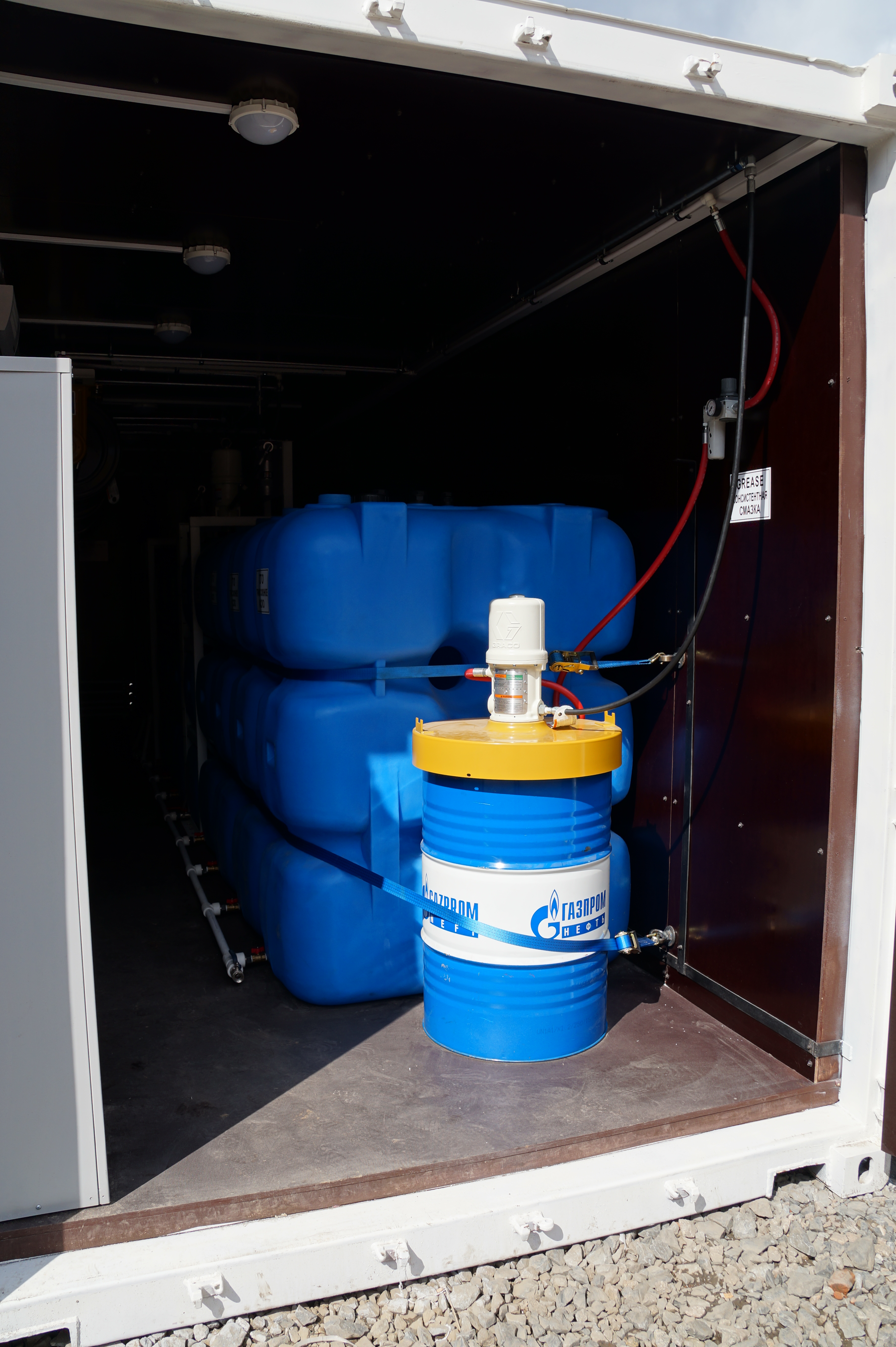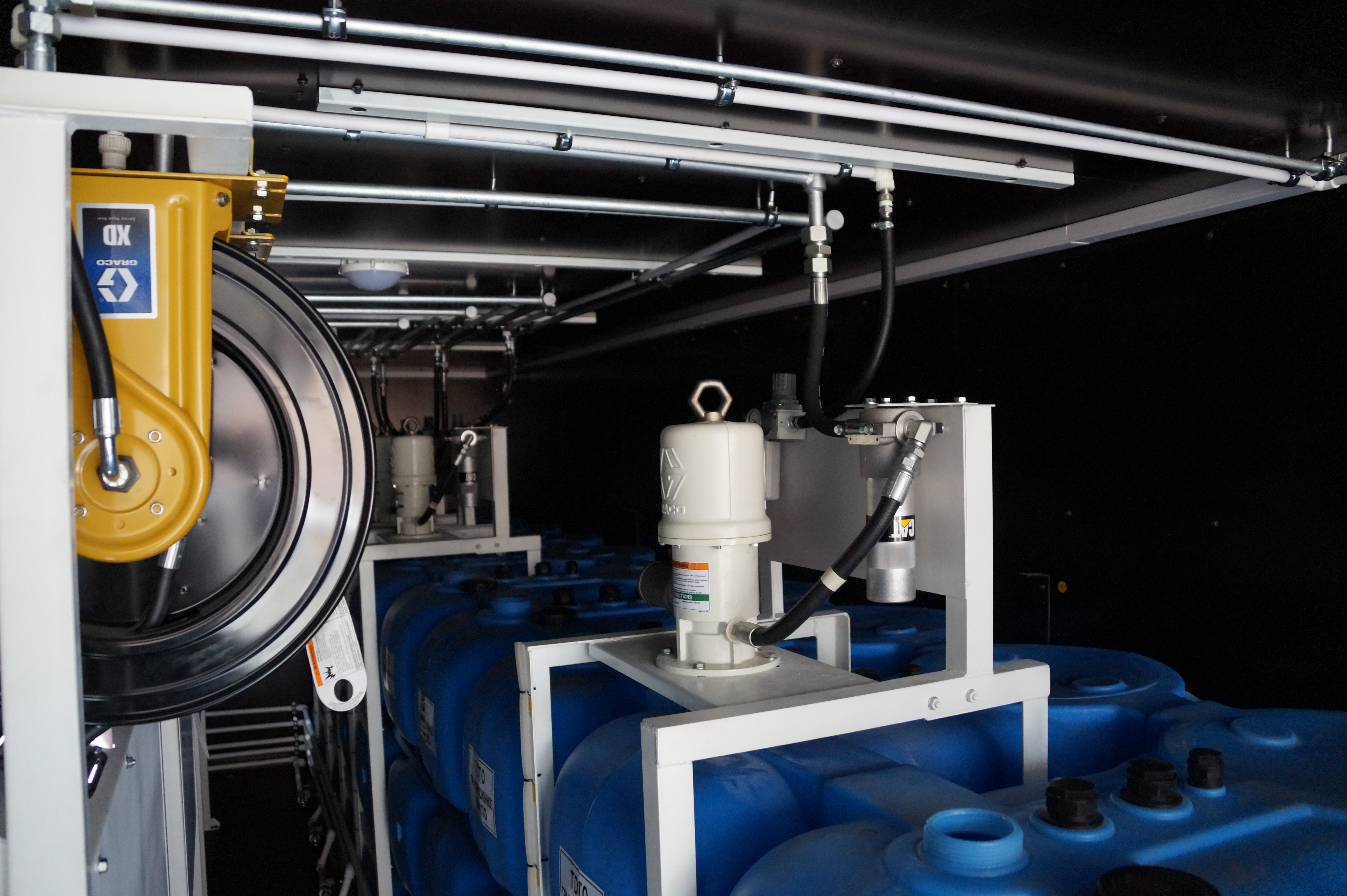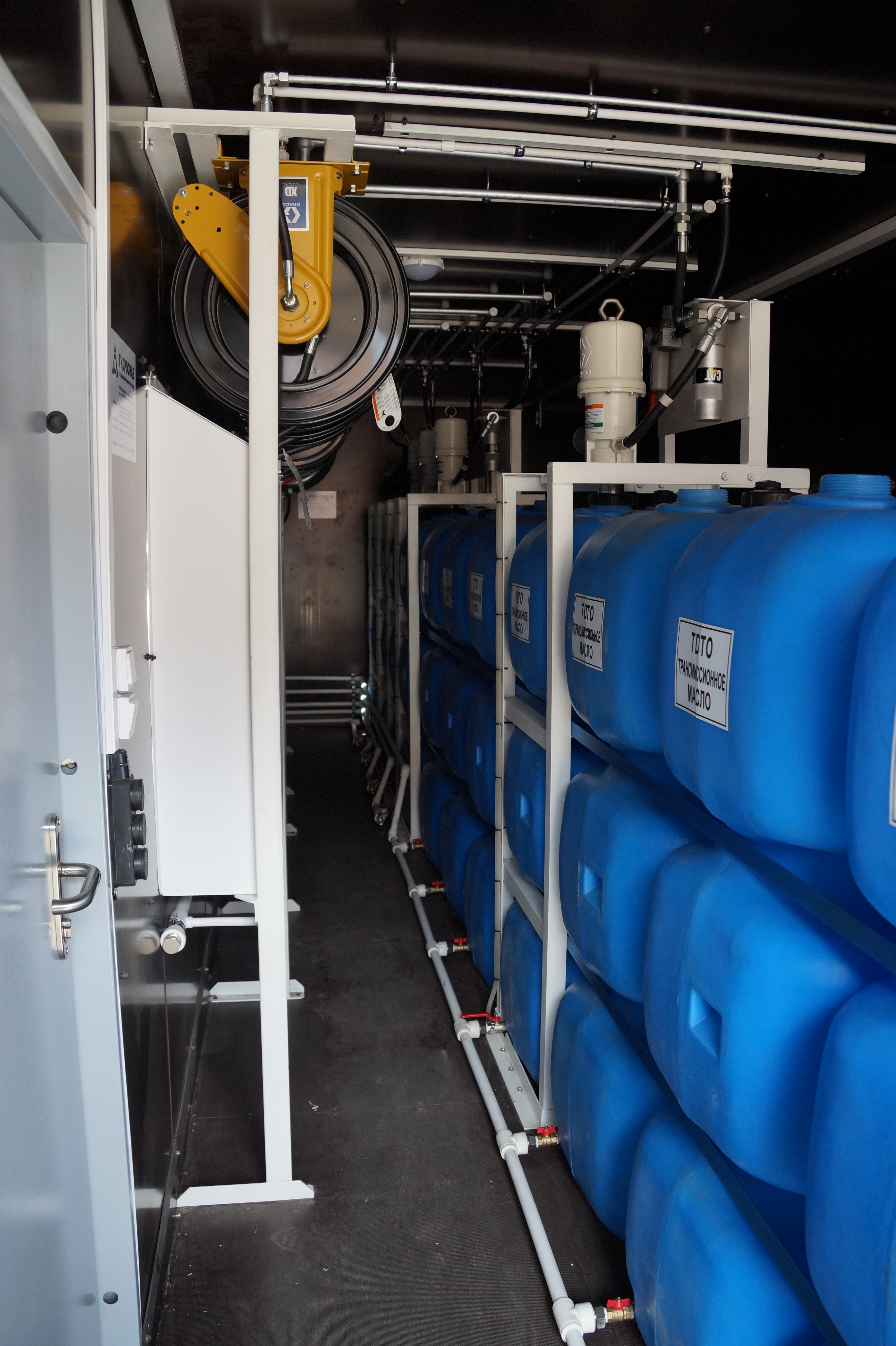 Заправка емкостей новой жидкостью осуществляется через быстроразъемное соединение, которое врезано в наружную часть контейнера с выводом блока распределения жидкости по емкостям в раздаточный технологический люк. Данная система заправки разработана специалистами нашего конструкторского бюро и является не только уникальной и не имеющей аналогов, но и практичной в использовании. Раздача жидкости осуществляется через инерционные катушки усиленной конструкции с рукавом от 15 до 23 метров и раздаточные пистолеты со встроенными электронными расходомерами фирмы Graco. Все технологический двери и люки выполнены в противопожарном исполнении. Для обеспечения высокого уровня безопасности производственное помещение оснащено как автоматической системой пожаротушения, так и порошковыми огнетушителями.