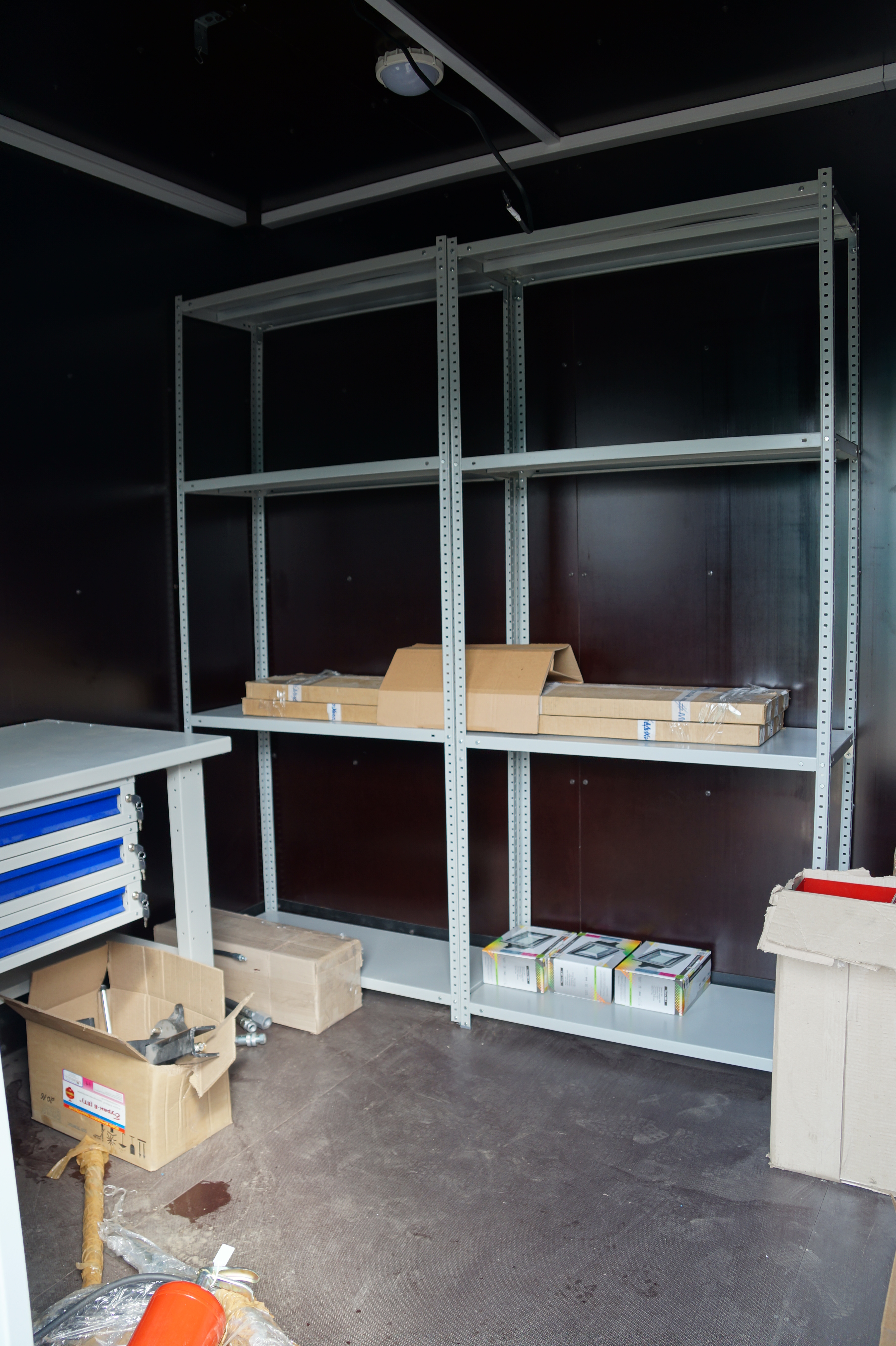 Для удобства внутренняя часть контейнера разделена на 2 помещения - сервисное и производственное, которые оснащаются отдельным входом. В сервисном помещении установлены стеллажи для хранения различных фильтрующих элементов, обтирочного материала, различных инструментов. Также в нем расположен верстак с тисами для проведения мелких слесарных работ.